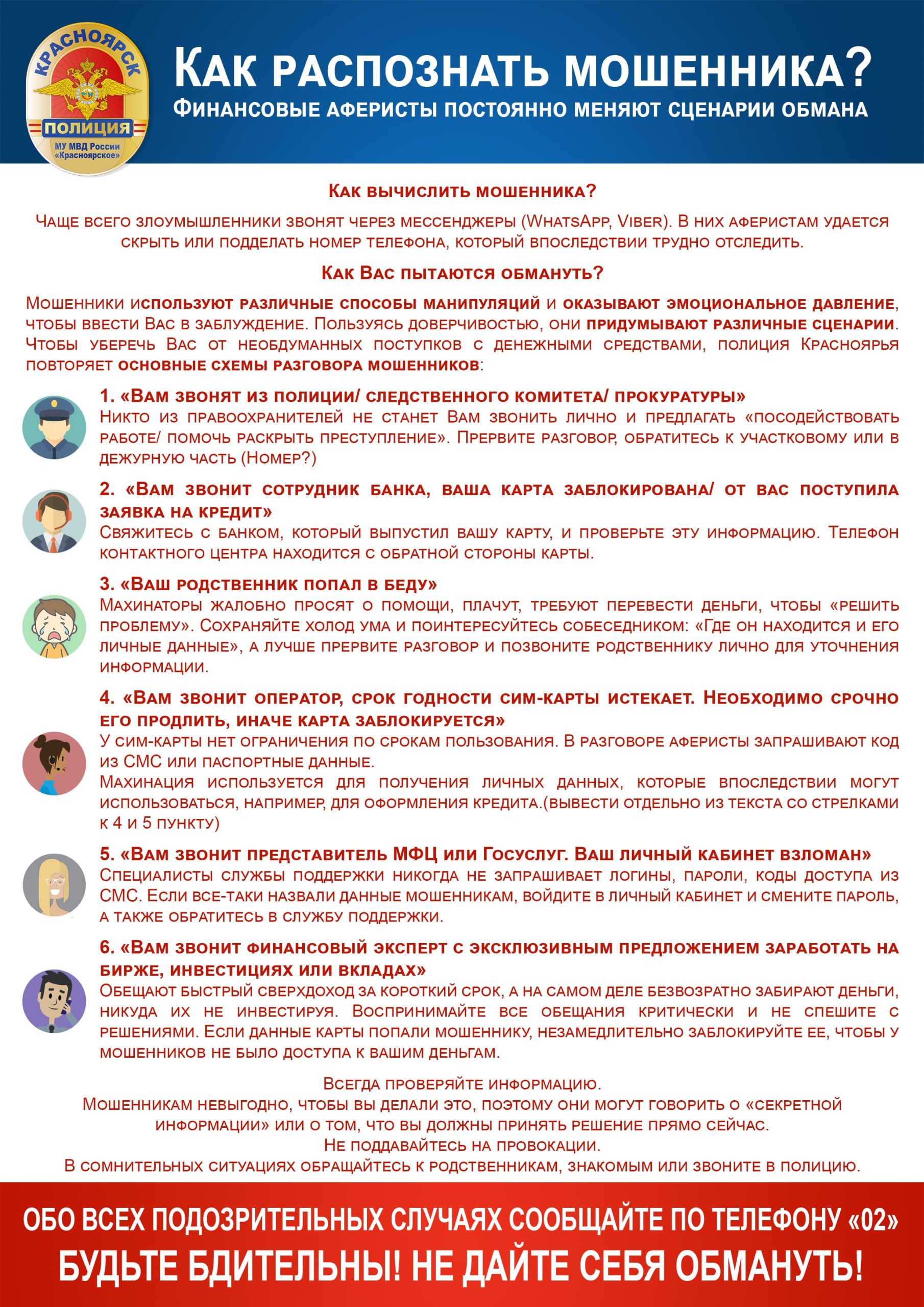 НЕ ДОВЕРЯЙТЕ, если вам звонят и сообщают, что ваш родственник или знакомый совершил ДТП и теперь за него нужно внести залог, штраф, взятку, купить дорогие лекарства – ЭТО ОБМАН!