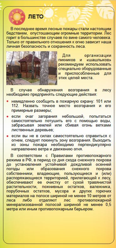 - при нахождении в лесопарковых зонах не оставляйте мусор, стеклянную посуду, промасленные или пропитанные горючими веществами материалы (ткань, бумагу и т.п.).