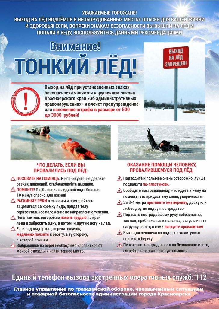 Внимание! Купание в необорудованных местах опасно для жизни и здоровья! Не оставляйте детей у водоёмов без присмотра и не отпускайте их к воде одних! Купание в местах с установленными знаками безопасности на водных объектах «Купаться запрещено!» является нарушением статьи 1.6. Закона Красноярского края от 02.10.2008 № 7-2161 «Об административных правонарушениях» и влечёт предупреждение или наложение административного штрафа на граждан в размере от пятисот до трех тысяч рублей. Номер телефона экстренных служб – 112.