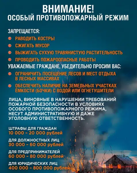 В этот период запрещается: применение любых видов открытого огня, разведение костров, сжигание сухой травы и мусора на территориях населенных пунктов.